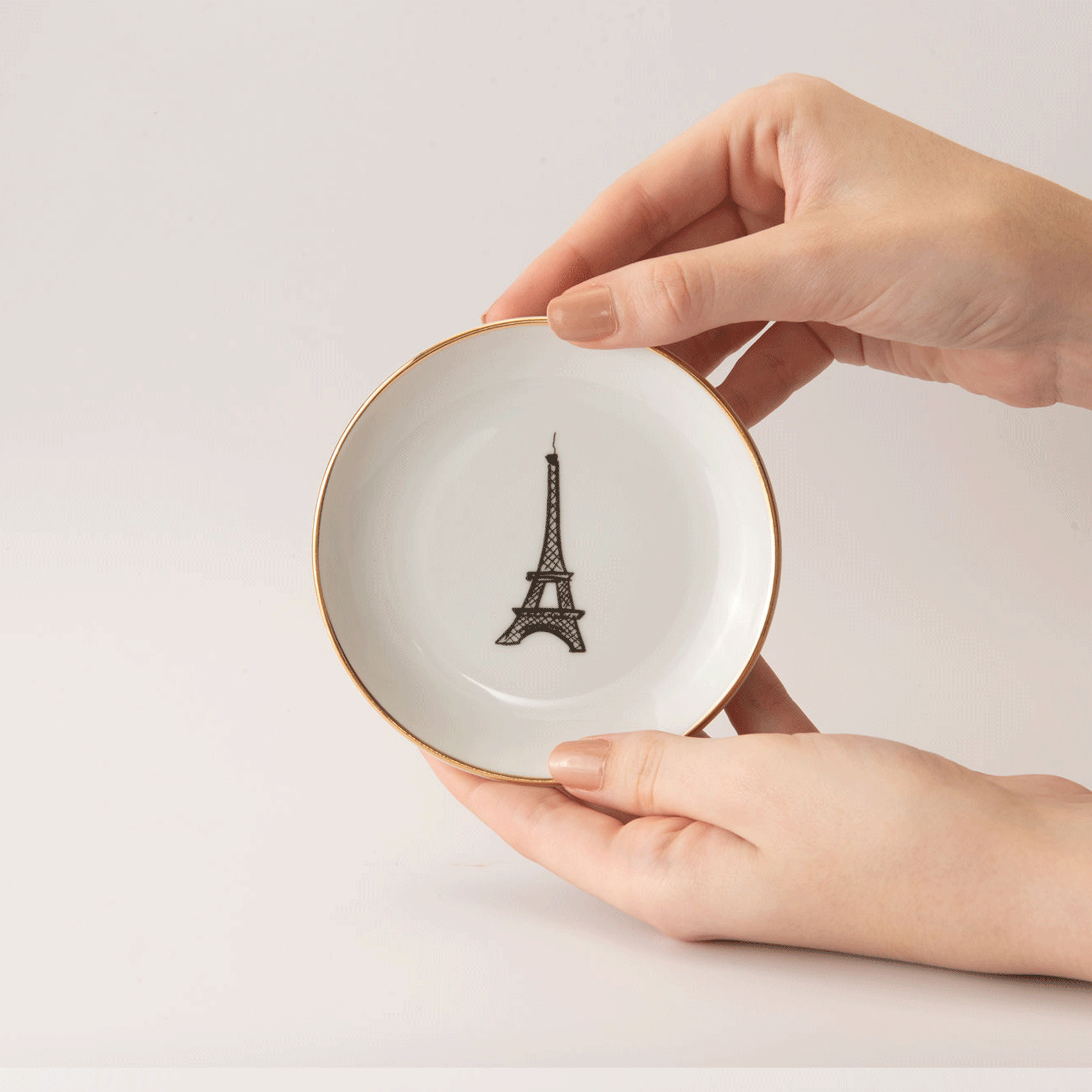 Pratinho de porcelana com desenho de Torre Eiffel em preto e filete em ouro.