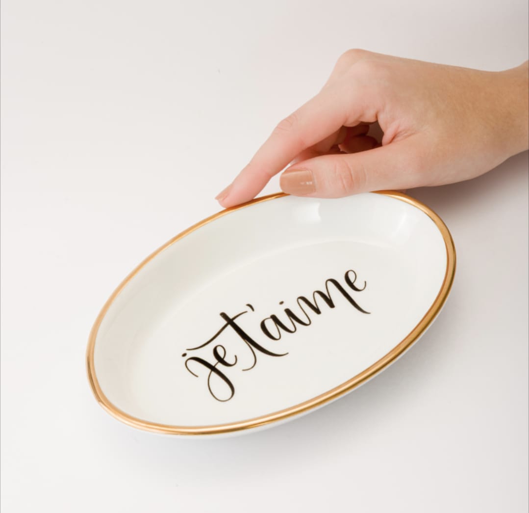 Pratinho oval de porcelana branca com friso em ouro e frase “je t`aime” em preto.