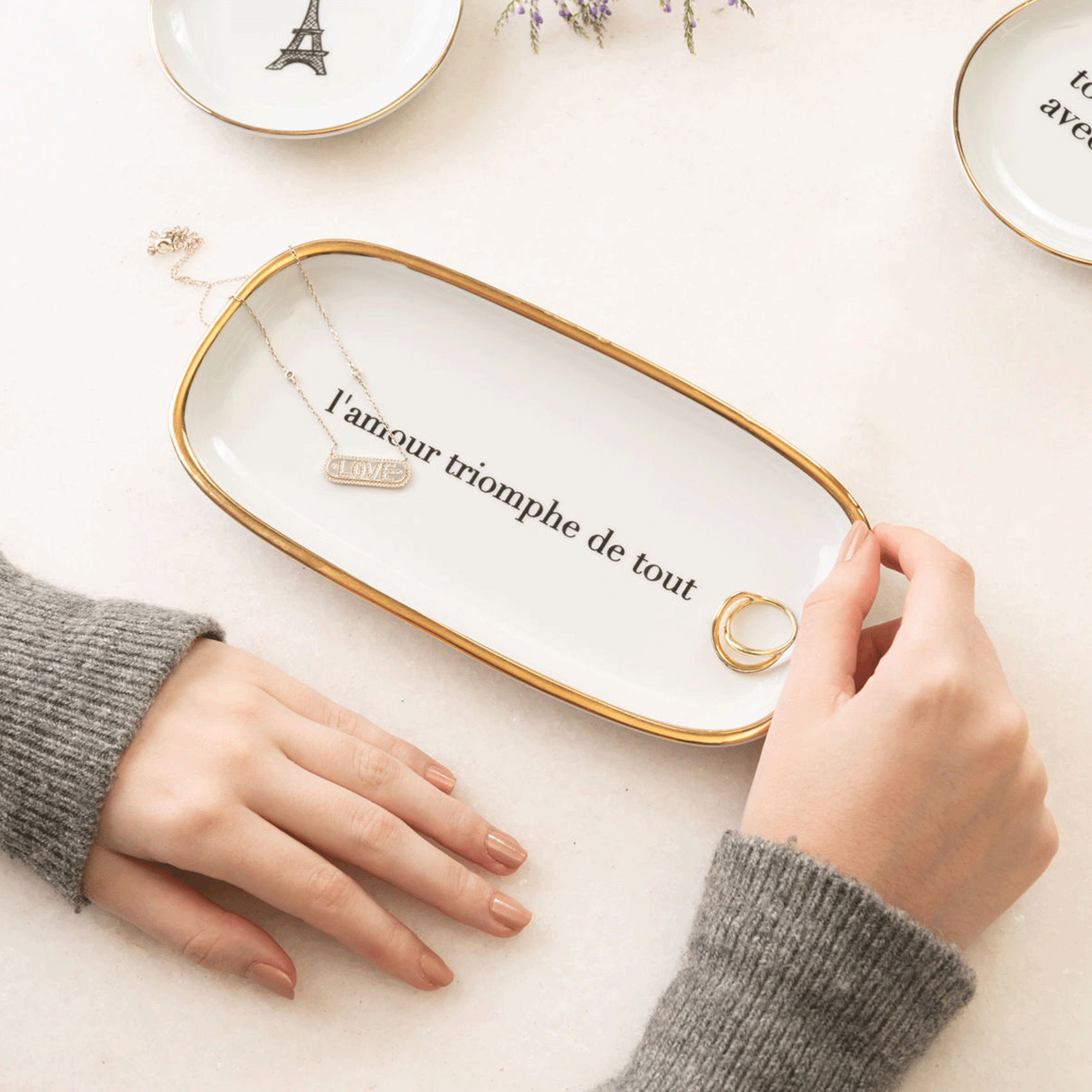 Pratinho retangular de porcelana branca com friso em ouro e frase “L’amour triomphe de tout” em preto.
